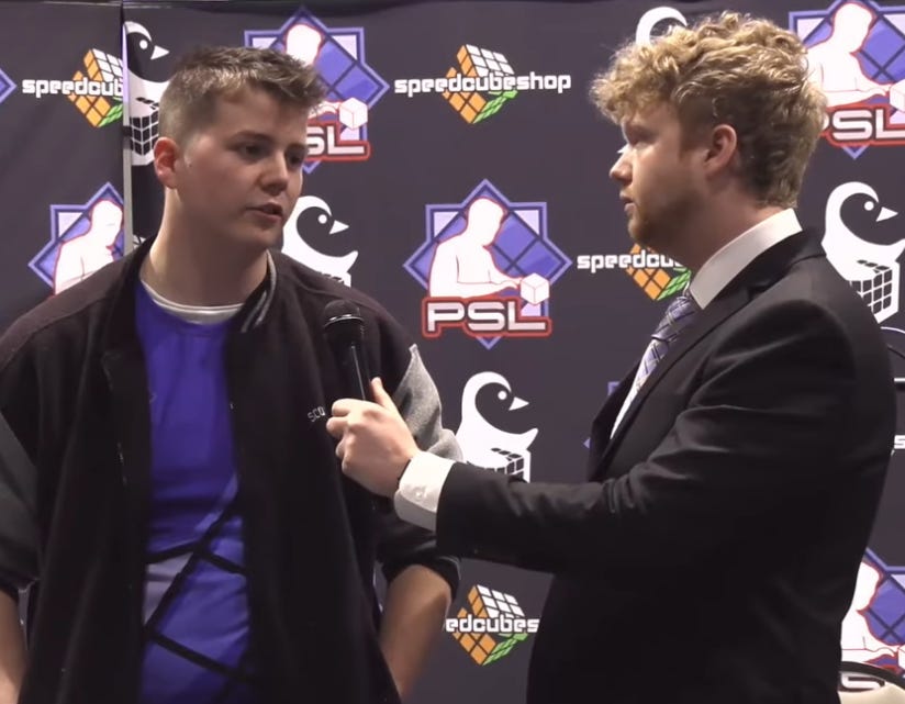 Luke Griesser is interviewed by John Eppley after winning PSL Michigan. Photo courtesy of SpeedcubingTV.